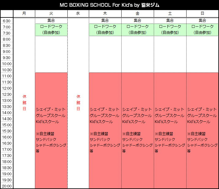 | ご利用時間 | 火・木・金・土・日曜日 / 11:00~20:00 月・水・毎月第3(日)/ 休校日 ・7:00からのランニングは自由参加 ・シェイプミット ・Kid’sスクール ・グループスクール 時間帯で専用プログラムを組んでいますが、いつ来ても、練習できます。 時間にこだわらず、好きな時に好きなだけトレーニング可能です。 |